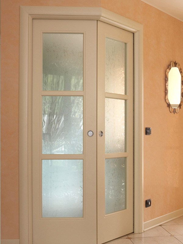 Il pannello tamburato è rivestito con tranciati di legno pregiato per essere poi verniciato.